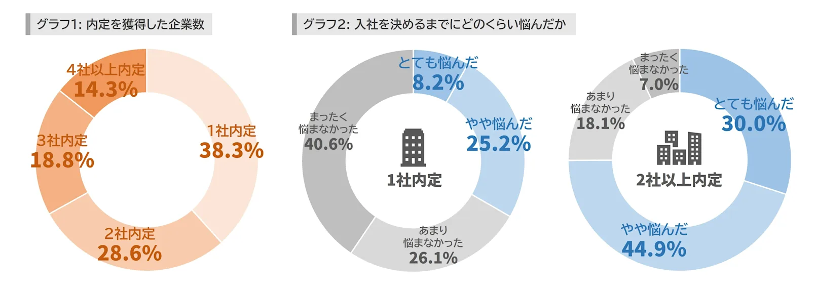 複数の内定を獲得した就活生の4人に3人が「どの企業に入社したらいいのか」に悩んでおり、また、内定が1社のみの場合も、3人に1人は「この会社に入社していいのか」に悩んだ経験があることが分かります。