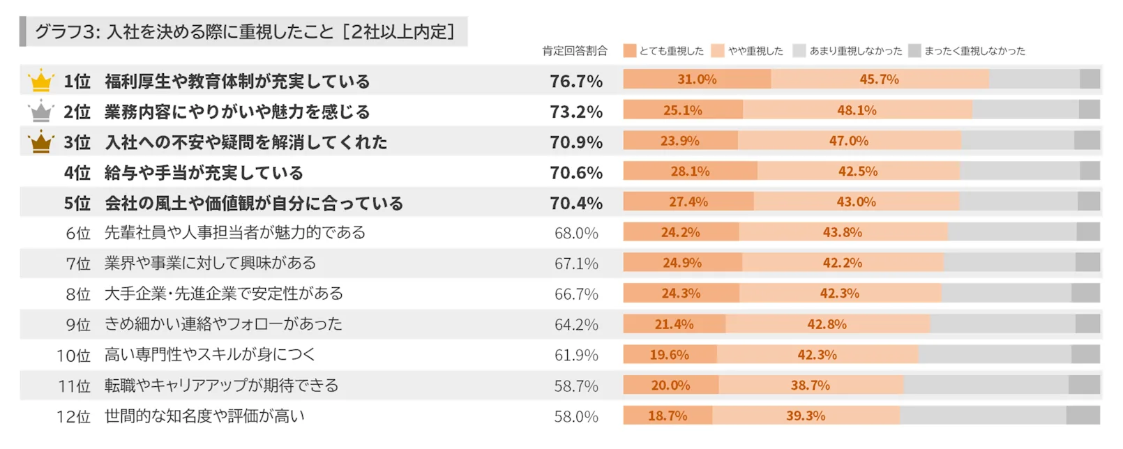 続いて、≪入社を決める際に重視したこと≫を見ていきましょう。この記事では、2社以上内定の方の回答結果をピックアップして解説いたします【グラフ3】。