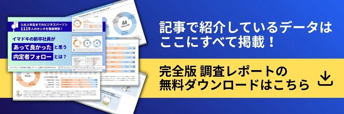 優秀な人材をつなぎとめるためには、入社への不安を解消し、企業への期待や信頼感を高める「内定者フォロー」が必要不可欠です。この連載記事では、ダイヤモンドHRD総研が、入社3年目までのビジネスパーソン1,119人を対象に実施したアンケート調査の結果をもとに、イマドキの内定者の実態とフォローのポイントを読み解いていきます。