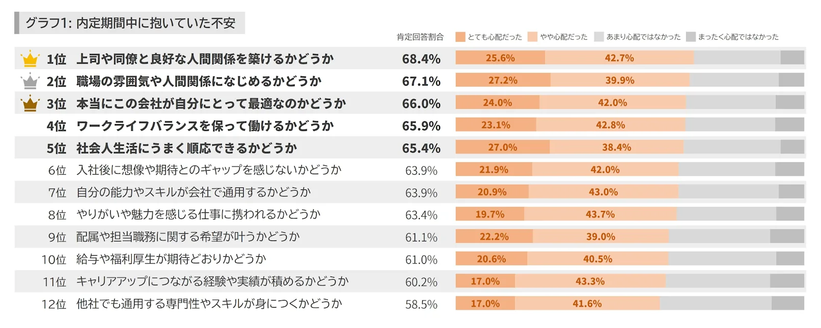 1位は「上司や同僚と良好な人間関係を築けるかどうか(68.4%)」で、2位の「職場の雰囲気や人間関係になじめるかどうか(67.1%)」と並んで、入社後の「人間関係」に関する不安がトップを占めました。
