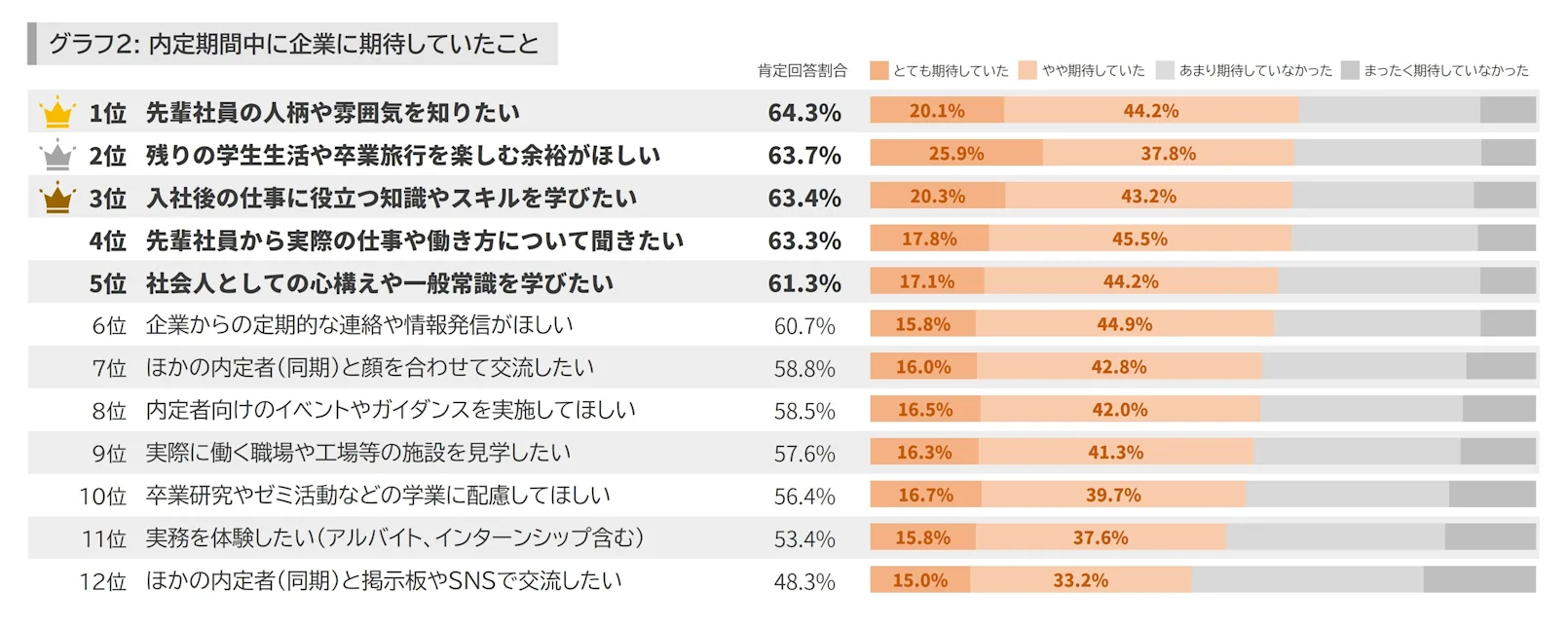 3位には「入社後の仕事に役立つ知識やスキルを学びたい(63.4.%)」、5位には「社会人としての心構えや一般常識を学びたい(61.3%)」がランクインしました。入社に向けての準備やスキルアップを図りたいと考える内定者も多いようです。