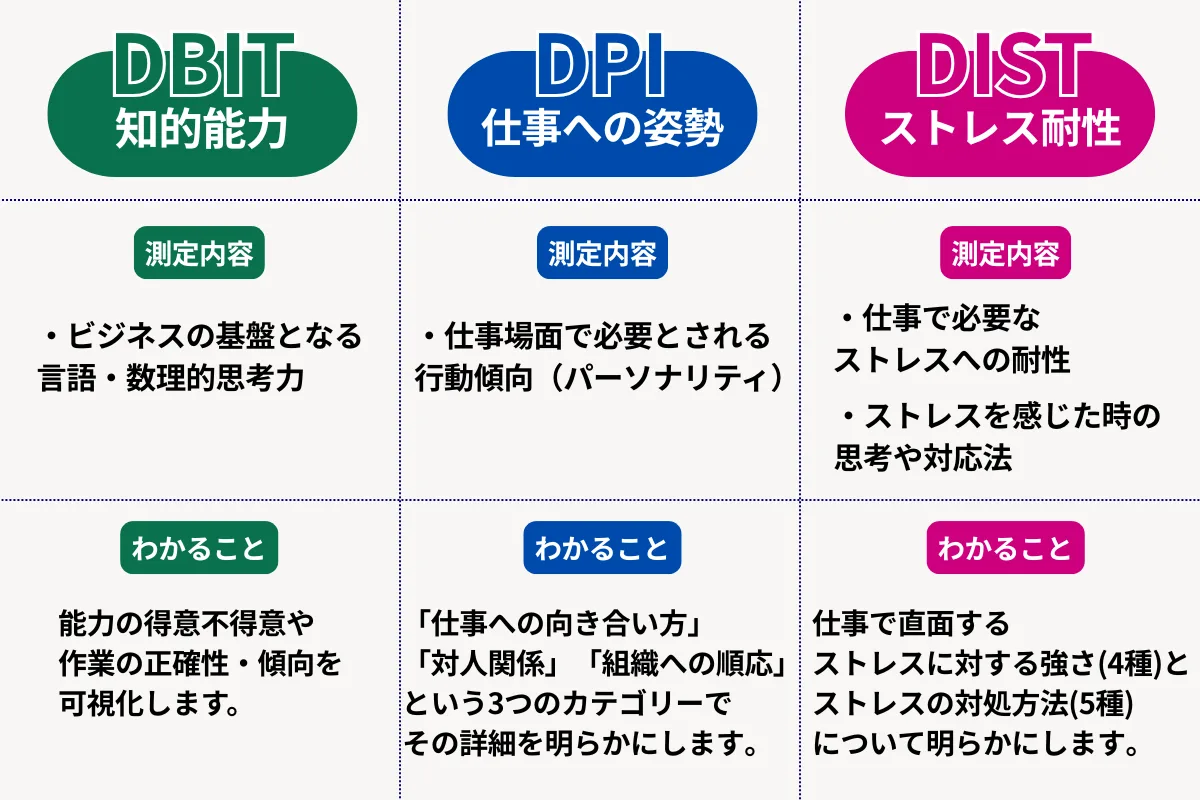「基礎的な知的能力」「仕事への姿勢(態度)」「ストレス耐性」の3つの観点で、