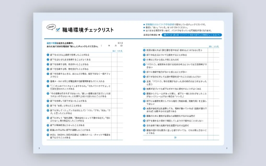 「パワハラ度」がわかる30項目のチェックリストと各項目の説明を読むことで、気をつけるべきポイントがよくわかります。